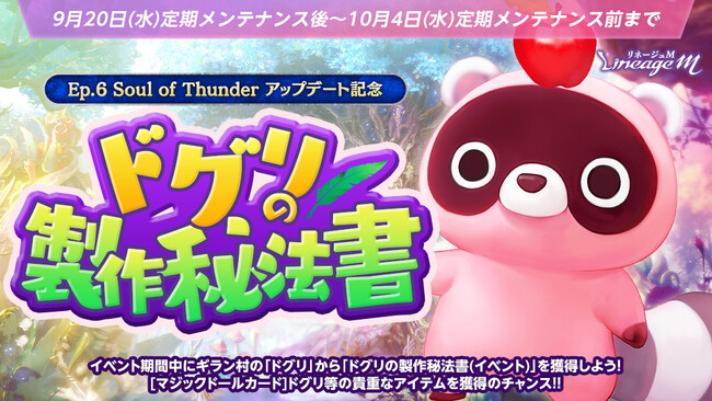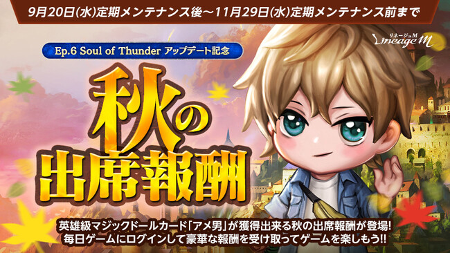 PCオンラインRPG「リネージュ」のモバイル版タイトル『Lineage M(以下、リネージュM)』のサービス、運営をしているエヌ・シー・ジャパン株式会社(東京都港区、代表取締役:金 澤憲(キム テクホン) 以下、エヌシージャパン)は、2023年9月20日(水)に、日本限定英雄級マジックドール「アメ男」が獲得できる「秋の出席報酬」を含むイベント3種の開始をお知らせします。