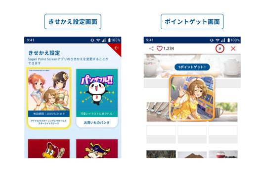 限定描き下ろしイラストは、「Super Point Screen」のロゴをモチーフとする衣装を着用したアイドルのオリジナルイラストで、キャンペーン期間中に様々な施策で登場します。期間中は「Super Point Screen」アプリの「きせかえ設定」画面でアプリ全体を「デレステ」仕様にできるほか、キャンペーンページからエントリーすると、描き下ろし壁紙の進呈と、条件達成で「一緒に10周年 コラボ限定描き下ろしアクリルスタンド」が抽選で当たるキャンペーンを実施します。さらに公式SNSでも、条件達成で同アクリルスタンドが抽選で当たるキャンペーンを実施するなど、様々な施策で盛り上げます。