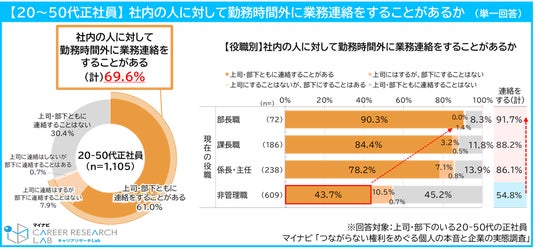 また、勤務時間外に「連絡をすることがある」も69.6%に達し、「上司・部下の両方に連絡する」が61.0%で最多、部長クラスが90.3%で最も高く、非管理職は43.7%で最も低い。