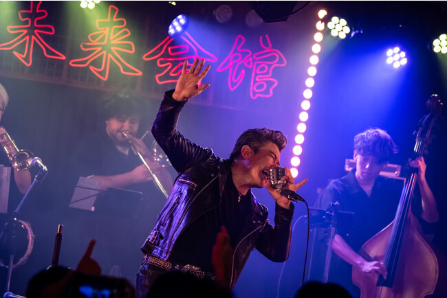 いかした革ジャン、リーゼント、銀のバックルにエンジニアブーツ。「行くぞ!」と一声吼えると、ガイコツマイクをひっつかみ、1曲目「ロカビリーカーニバル」からぶっ飛ばす上澤津。フロアを埋めたオーディエンスに笑いかけ、拳を振り上げ、「東京バーニングタウン」「傷だらけのパラダイス」とアップテンポのMAGICナンバーを畳みかける。ホーン隊を含む7人のバンドメンバーは凄腕揃いで、疾走感とスウィング感を兼ね備えたご機嫌なサウンドで後ろからガンガン煽る。