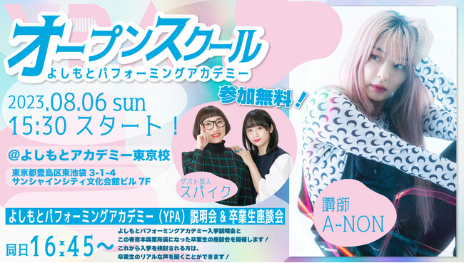 数多くのスターを輩出する国内最大規模のお笑い養成所NSC(吉本総合芸能学院)、マネージャー、構成作家、劇場・ライブプロデューサー、番組ディレクターetc...数多くの即戦力エンタテイメントスタッフを輩出するよしもとクリエイティブアカデミー(YCA)、俳優、パフォーマー、歌手、よしもとから“本格的”にデビューを目指すタレント養成所よしもとパフォーミングアカデミー(YPA)、よしもとでエンタメ×デジタルの最前線を学び即戦力を目指すスクールよしもとデジタルエンタテインメントアカデミー(YDA)、よしもとのスクールでエンタメを学び高校卒業資格が取れるよしもとの学校、吉本興業高等学院。これら5校からなる吉本興業グループの唯一の教育機関であるよしもとアカデミーは、この度、すべてのスクールの授業の特徴が1日で分かる「夏休み 1DAYオープンスクール」を8月6日(日)に開催します。