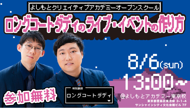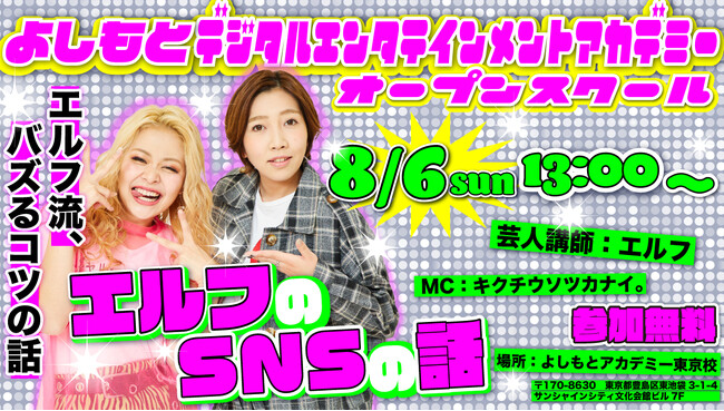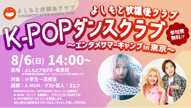 また、小学生、中学生、高校生を対象に、子どもたちが放課後の時間を利用してエンタメなどを楽しく学べるクラブ活動「よしもと放課後クラブ東京校」では、今年4月に実施した「よしもと放課後クラブ」を体験できるワークショップがご好評につき、この夏休み期間「よしもと放課後クラブ エンタメサマーキャンプ in 東京」を開催します。当日は、漫才ワークショップ、K-POPダンス教室、YouTube動画制作が、入学前に体験ができます。講師は、マユリカとサンシャイン(漫才ワークショップ)、A-NONとエルフ(K-POPダンス教室)、レインボー(YouTube動画制作)らが務めます。