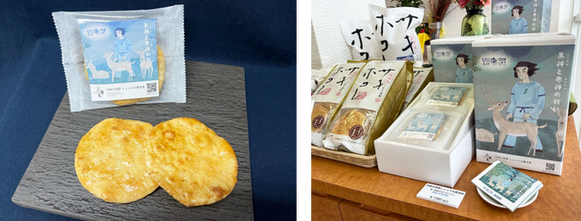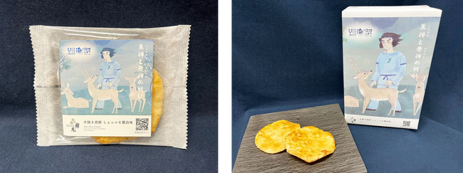 秋田県男鹿市に伝わる民話『黒神と赤神の戦い』のアニメ名場面のシールを外箱と個包装に貼付。煎餅は秋田県産あきたこまち一等米の生地を手焼きし、味付けは秋田県男鹿市の民話にちなみ、地元の諸井醸造(男鹿市)のハタハタを原材料とした旨味調味料「しょっつる」を隠し味に使用しました。
