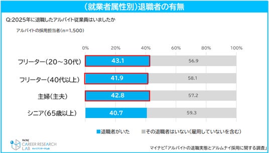 株式会社マイナビ(本社:東京都千代田区、代表取締役 社長執行役員:粟井 俊介)は、直近1年以内にアルバイト採用業務に携わった会社役員・自営業を含む20~69歳の会社員(有効回答数:1,500名)を対象に実施した「アルバイトの退職実態とアルムナイ採用に関する調査」の結果を発表しました。