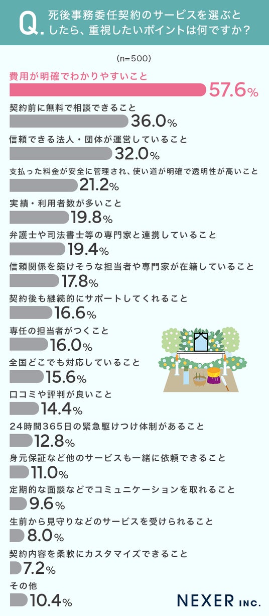 死後事務委任契約のサービスを選ぶとしたら、どのようなポイントを重視したいかを聞いてみました。