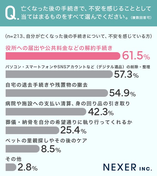 次いで「パソコン・スマートフォンやSNSアカウントなど(デジタル遺品)の削除・整理」が57.3%、「自宅の退去手続きや残置物の撤去」が54.9%と続きます。