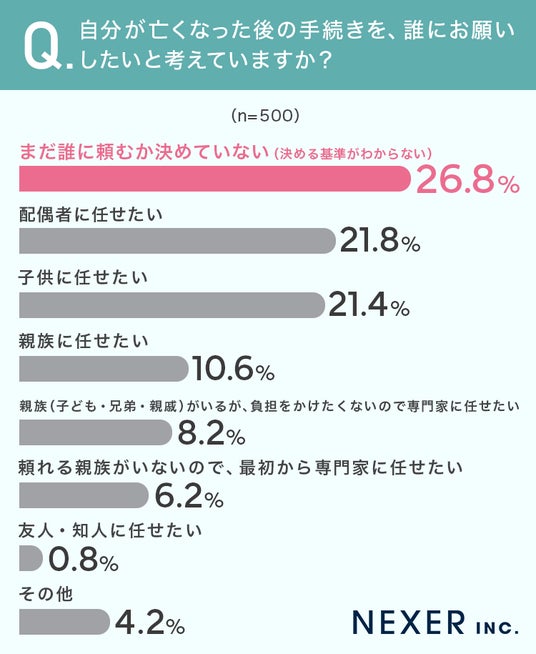 もっとも多かった回答は「まだ誰に頼むか決めていない(決める基準がわからない)」で26.8%でした。次いで「配偶者に任せたい」が21.8%、「子供に任せたい」が21.4%、「親族に任せたい」が10.6%と、家族に託したいという声が多くみられます。
