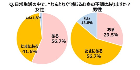 ある、たまにあると答えた女性は約96%。男性も約86%で、男女ともに大半の人が「なんとなく不調」を感じている!