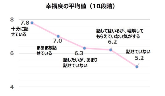 現在の幸福度を10段階で選択してもらったところ、不調について「十分に話せている」「まあまあ話せている」と感じている人は幸福度が高く、「話せていない」「理解してもらえていない」と感じている人は下がっていく傾向に!