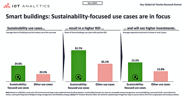 持続可能性に直接影響を与えるスマートビルディングのユースケースは、他のユースケースよりも高いROI(投資収益率)をもたらしています。サステナビリティに焦点を当てたユースケースへの投資は、今後2年間で15%増加すると考えられます。