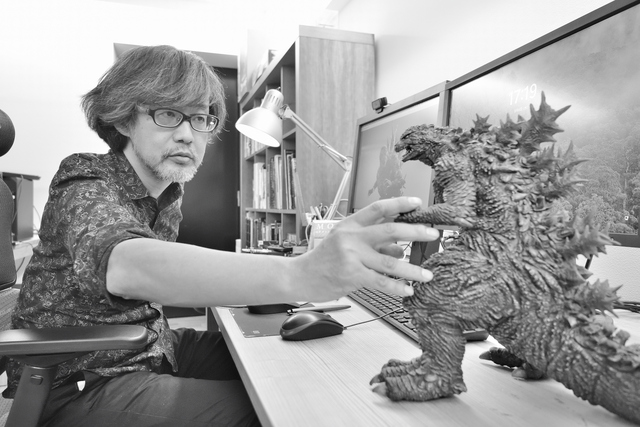 山崎さんのデスクの上には、自身が手掛けた「ゴジラ作品」のフィギュアが飾ってある。