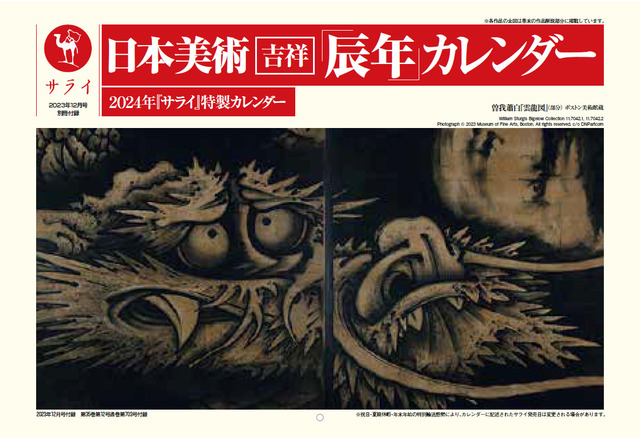 11月9日発売の『サライ』12月号特別付録は、2024年日本美術 吉祥「辰年」カレンダー。伊藤若冲や長谷川等伯、葛飾北斎、円山応挙ほか、名声の高い画家たちの、めでたい「龍」にまつわる “月めくり” のカレンダーです。