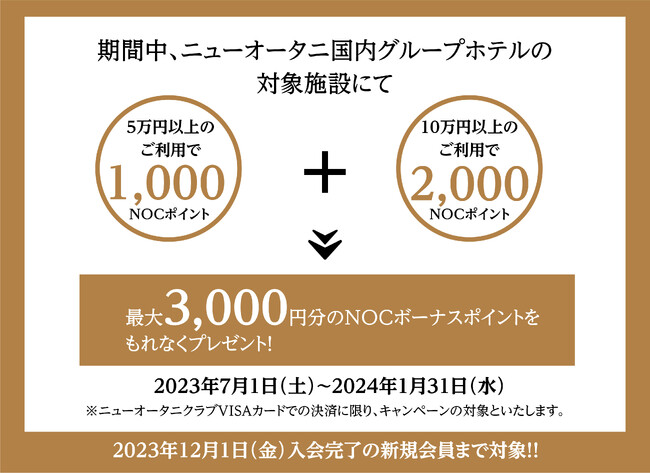 本キャンペーンは、ホテル会員組織『ニューオータニクラブ VISAクラシックカード』『ニューオータニクラブ VISAゴールドカード』『ニューオータニクラブ VISAカード』をすでにお持ちのホテル会員さまと、2023年12月1日(金)までに新規入会が完了した方を対象とし、期間中にニューオータニ国内グループホテルのご宿泊・直営レストラン・バーにて合計5万円(税金・サービス料共)以上ご利用&現地で対象カードにてお支払いいただいた方へ、ご利用金額に応じたニューオータニクラブポイントに加え、最大3,000ポイントをプレゼントいたします。