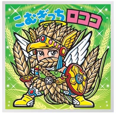 「こむぎっち」をビックリマンの中でも大人気の「ヘッドロココ」がまとい、新たに「こむぎっちロココ」が誕生しました。背景には、すくすく伸びる小麦の穂がきらめいています。