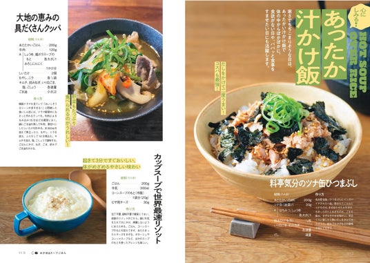 定番のまぜごはんや炊き込みごはんにも新風を。油揚げを刻んでまぜるだけでおいなりさんが味わえる「2分で!まぜ込みいなり」、さつまいもとさきイカを合わせる「おさつとさきイカのじわる炊き込み」など、意外なつくりかたや材料のレシピが満載。