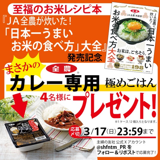 この度、書籍発売を記念し、抽選で4名様に「JA全農 カレー専用 極めごはん 山形県産雪若丸 230g×12パック」をプレゼントいたします。主婦の友社の公式Xアカウント(@shfntm_PR)をフォローし、投稿内容をリポストして応募完了となります。