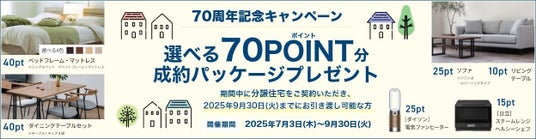 大和ハウス工業株式会社の分譲住宅を2025年7月3日~9月30日までに、土地建物売買契約を締結していただき2025年9月30日までに引き渡し可能な方。選べる70ポイント分の成約パッケージをプレゼント。※70ポイント=35万円(税込)相当