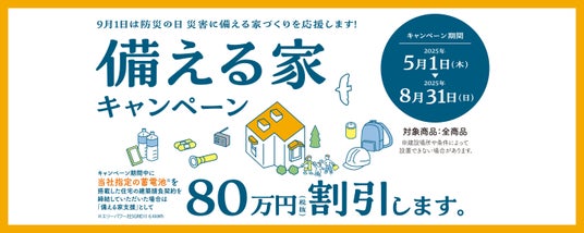 2025年5月1日~8月30日の期間中、当社指定の蓄電池を搭載した住宅の建築請負契約を締結していただくと 「備える家キャンペーン」として80万(税抜)割引をいたします。