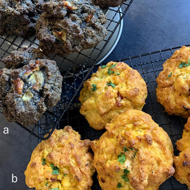 a/バナナと相性抜群な黒ゴマをたっぷり練り込んだ真っ黒スコーン。b/甘みが出るまで炒めた玉ねぎとベーコン、マッシュしたパンプキンを加えた、お食事タイプの鮮やかな黄色スコーン。