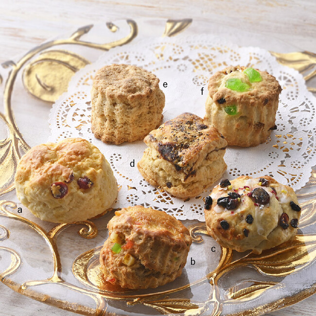 d/フィグ&チーズ・ブラックペッパーのスコーン。e/インド産アッサムの紅茶と5種のスパイス香るスコーン。f/ドレンチェリーやクランベリー等のドライフルーツとバニラビーンズを練り込んだクリスマス限定スコーン。