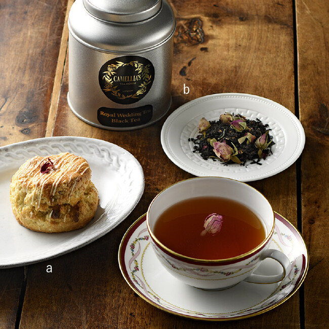 目黒の名店〈スリーティアーズ〉と〈カメリアズティーハウス ロンドン〉のコラボレーションで新作スコーンが登場! 〈カメリアズティーハウス ロンドン〉の人気ブレンド「ロイヤルウェディングティー」に合うスコーンを、大の「ロイヤルウェディングティー」ファンの一ノ木理恵シェフが考案のバターリッチな生地にロースペタルとミルクの風味豊かなホワイトチョコレートを練り込みました。