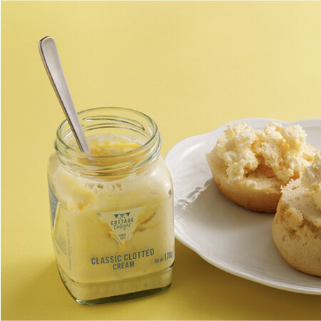 1974年、イングランドの中心部スタッフォードシャーに設立された〈コッテージデライト〉。手作業で作るバターファッジ(砂糖菓子)から始まり、ジャム、マーマレードなどを、昔ながらの手法で提供し続けています。そんな〈コッテージデライト〉のクロテッドクリームは、リッチでクリーミーな味わい。手間暇かけてゆっくりと少量ずつ作られ、四角い可愛らしい瓶に詰められています。特殊製法により、常温での長期保存も可能。温かいスコーンに添えたり、ジャムと一緒に召し上がれ。