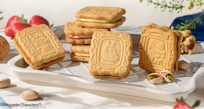 コク豊かでミルキーなホワイトソイショコラに森の実りを練り込みました。クルミ味、ストロベリー味、ピスタチオ味があり、サクサクでおいしい分厚いクリームサンドです。ムーミンママとリトルミイが描かれた可愛いパッケージも特徴的です。