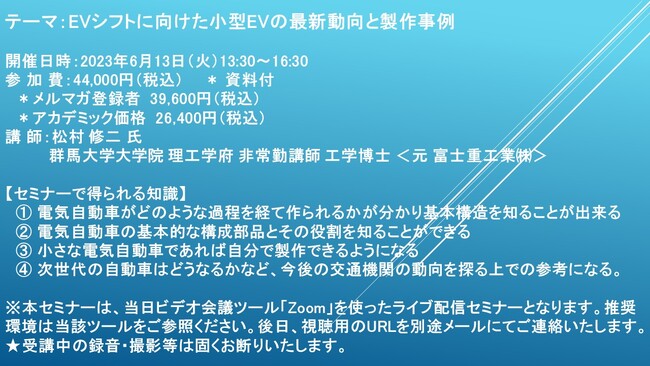 先端技術情報や市場情報を提供している(株)シーエムシー・リサーチ(千代田区神田錦町: https://cmcre.com/ )では、 各種材料・化学品などの市場動向・技術動向のセミナーや書籍発行を行っておりますが、 このたび「EVシフトに向けた小型EVの最新動向と製作事例」と題するセミナーを、 講師に松村 修二 氏 (群馬大学大学院 理工学府 非常勤講師 工学博士 <元 富士重工業(株)>)をお迎えし、2023年6月13日(火)13:30より、 ZOOMを利用したライブ配信で開催いたします。 受講料は、 一般:44,000円(税込)、 弊社メルマガ会員:39,600円(税込)、 アカデミック価格は26,400円(税込)となっております(資料付)。