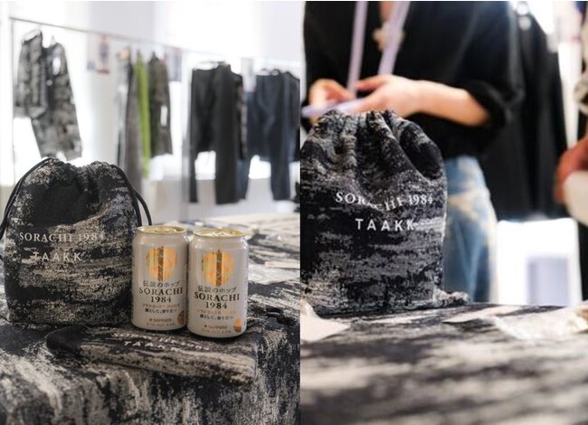 今回のイベントは、ファッションブランドTAAKK(ターク)のデザイナー、森川拓野氏と「SORACHI 1984」のブリューイングデザイナー、新井健司氏の過去3度のトークセッションがきっかけで実施されたコラボ企画です。「TAAKK」2024年春夏コレクション来場者に「SORACHI 1984×TAAKK オリジナルバッグ」とともに「SORACHI 1984」を配布しました。