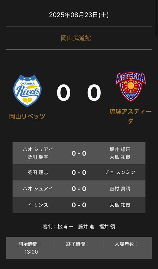ノジマTリーグ 2025-2026シーズン 公式戦 8月23日開催 「岡山リベッツ vs 琉球アスティーダ」の対戦オーダーを発表いたします。