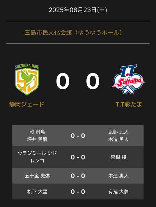 ノジマTリーグ 2025-2026シーズン 公式戦 8月23日開催 静岡ジェード vs T.T彩たまの対戦オーダーを発表いたします。