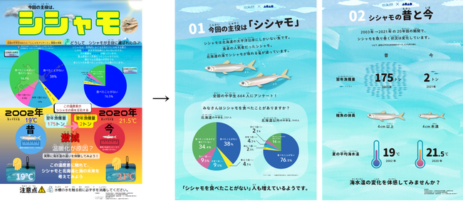・概要:北海道むかわ町の「シシャモ」をテーマに中学生3名が考案したインフォグラフィックパネルをはじめとする様々な制作物を展示