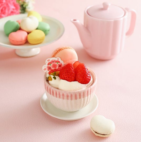 ジューシーな苺のムースに人気のマカロンを丸ごと飾った、母の日のカップデザートです。