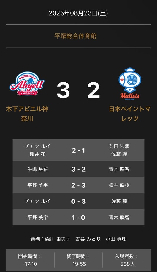 ノジマTリーグ 2025-2026シーズン 公式戦 8月23日開催 木下アビエル神奈川 vs 日本ペイントマレッツの試合は3-2で木下アビエル神奈川 が勝利しました。
