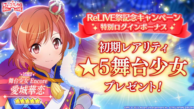 株式会社エイチームのグループ会社である株式会社エイチームエンターテインメント(本社:愛知県名古屋市、代表取締役社長:中内之公)と、株式会社ブシロード(本社:東京都中野区、代表取締役社長:木谷高明、以下ブシロード)および、株式会社TBSテレビ(東京都港区赤坂、代表取締役社長:佐々木卓、以下TBS)が共同開発したゲームアプリ『少女☆歌劇 レヴュースタァライト -Re LIVE-(スタリラ)』は、2023年10月13日(金)より、サービス開始5周年を記念して「Re LIVE祭キャンペーン」を開催します。