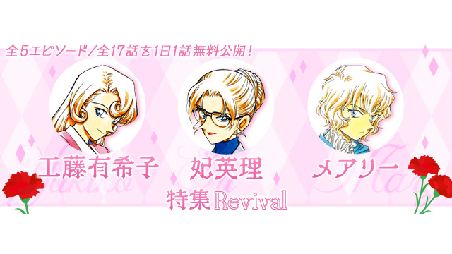 本特集では、母の日のシーズンにあわせて、「工藤有希子」「妃英理」「メアリー世良」が登場するエピソードをピックアップした特集のリバイバルを実施します。「名探偵コナン公式アプリ」内にて、全5エピソード17話を、1日1話無料でお読みいただけます。プレミアム会員の方は、公開された話は期間中いつでも無料購読できます。会員ではない方も期間中、第11巻の「コーヒーショップ殺人事件」と各エピソードの1話目は、公開後いつでも無料購読できます。