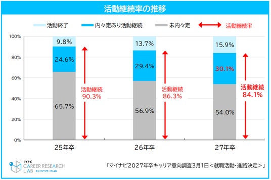 株式会社マイナビ(本社:東京都千代田区、代表取締役 社長執行役員:粟井俊介)は、2027年卒業予定の全国の大学生・大学院生を対象に実施した、「マイナビ2027年卒キャリア意向調査3月1日<就職活動・進路決定>」の結果を発表しました。