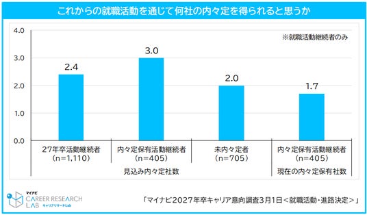 就職活動を継続する学生にこれからの就職活動を通じて何社の内々定を得られると思うか聞いたところ、平均は2.4社だった。内々定の有無別では、内々定を保有したまま活動を継続する学生は3.0社(現状の保有社数が平均1.7社のため、追加で1.3社の内々定を得られる)見込みのようだ。未内定者も平均で2.0社の内々定を得られると見込んでいる。【図4】