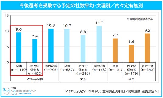 また、就職活動を継続する学生の、今後選考を受ける予定の社数は全体で平均9.6社だった。すでに内々定を保有する学生も今後、平均7.4社の選考に参加する予定であることから、就職活動が本格化するのはこれからであると言える。【図2、3】