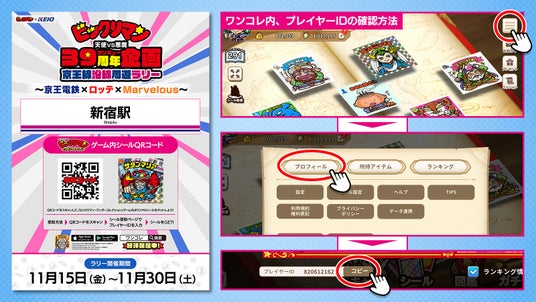 「新宿駅」、「桜上水駅」、「調布駅」、「高幡不動駅」、「京王多摩センター駅」のラリースポットに設置してあるQRコードを読み込むことで、スマートフォン向けアプリゲーム『ビックリマン・ワンダーコレクション』専用デジタルシールがもらえます。期間内に指定駅を周り、5枚のオリジナルシールをGETしよう!