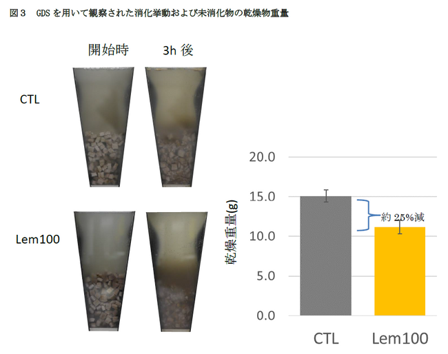 が約25%減少(乾燥重量ベース)していました(図3)。これは、Lem100群の方がより消化されたことを示し