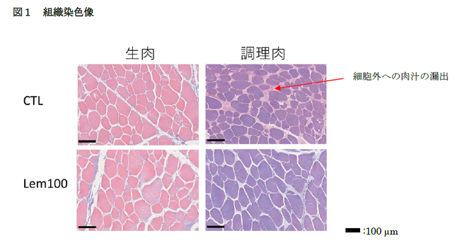ました(図1)。一方、Lem100群では、これらの現象が緩和されており(図1)、加熱調理時に起こる肉の