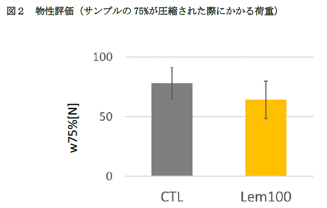 ・物性の変化:スライス肉サンプルを圧縮した際にかかる荷重は、CTL群と比べてLem100群の方が小さいため