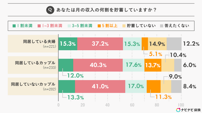 「あなたは月の収入の何割を貯蓄していますか?」の質問に対し、同居夫婦は37.2%、同居カップルは40.3%、同居していないカップルは41.0%が「月の収入の約1~3割」を貯蓄していると回答しました。
