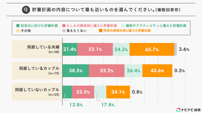 同居夫婦の貯蓄計画の内容で最も多いのは「将来の資産形成」、カップルでは「もしもの緊急時のため」