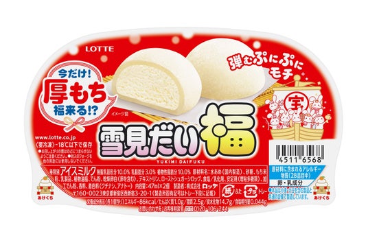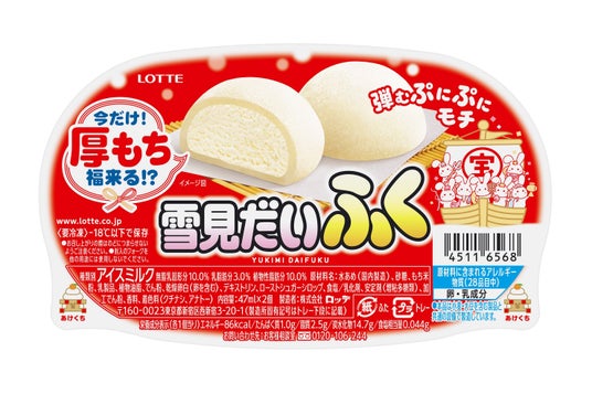 今年も冬季限定で“ふく”の文字がいつもより大きくなったパッケージデザインの「雪見だいふく」を12月上旬より順次リニューアル発売いたします。赤を基調としたパッケージデザインに加えて、おもちを増量した“厚もち仕立て”になって期間限定で登場!弾むぷにぷに食感がさらにアップした“厚もち仕立て” と、年末年始のおめでたい雰囲気をパッケージ全体で表現したデザインで、食べた人の心を癒やし、小さな幸せをお届けします。皆さまにたくさんの福が届きますように!