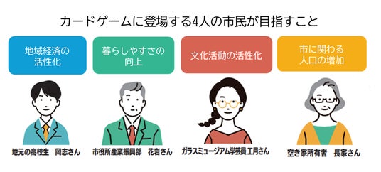 カードゲームの舞台は、「まいひな市」という架空の都市です。同市は、かつて鉱山で栄えていたものの、閉山を契機に少子高齢化や人口減少といった課題を抱えています。この状況を打開するため、地元の高校生、空き家所有者、市役所の産業振興部職員、ガラスミュージアムの工芸員という4人の市民が、それぞれの立場から地域活性化のアイデアを実行していくという設定でゲームを進めていきます。