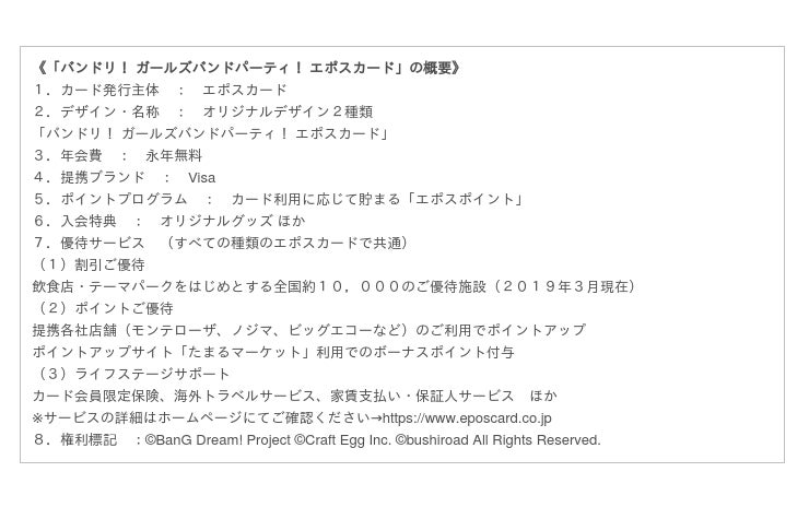 株式会社丸井グループ(本社:東京都中野区、代表取締役社長:青井 浩)は、株式会社ブシロード(本社:東京都中野区、代表取締役社長:橋本 義賢)と株式会社Craft Egg (本社:東京都渋谷区 代表取締役:森川 修一)との共同制作によるスマートフォン向けゲーム「バンドリ! ガールズバンドパーティ!」とのコラボレーションをスタート。2020年2月7日(金)より「バンドリ! ガールズバンドパーティ! エポスカード」を発行するほか、一部のマルイ店舗にて期間限定の物販イベントを開催いたします。