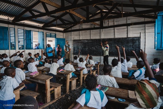 北キブ州のゴマ近くにある国内避難民キャンプ内の仮設学習スペースで、授業を受ける子どもたち。避難民の子どもたちが学習を続けられるよう、ユニセフが設置した。(コンゴ民主共和国、2024年6月24日撮影) (C) UNICEF_UNI604231_Benekire
