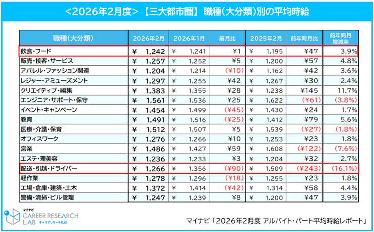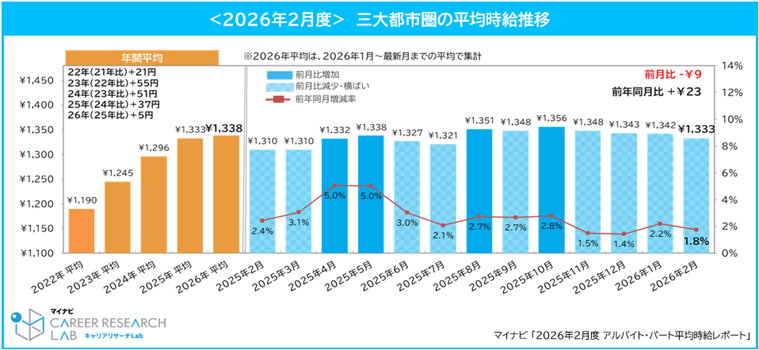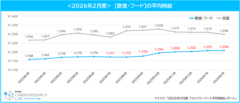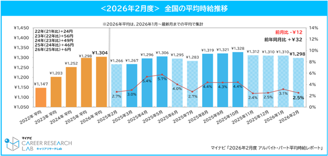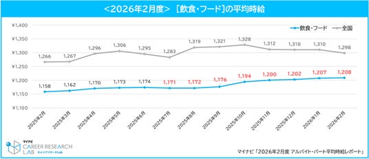 株式会社マイナビ(本社:東京都千代田区、代表取締役 社長執行役員:粟井俊介)は、「2026年2月度アルバイト平均時給レポート」を発表しました。本調査は、アルバイト・パート求人情報サイト『マイナビバイト』(https://baito.mynavi.jp/)に掲載された求人広告データを集計したものです。